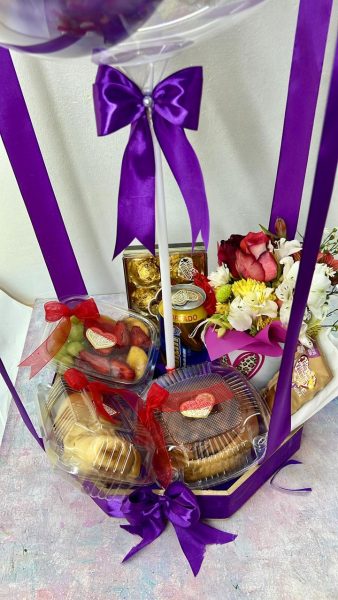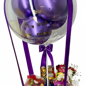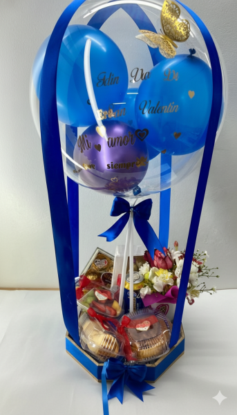 Nuestra bandeja de madera resistente viene decorada con cinta de colores de tu preferencia, y se acompaña de un hermoso globo Burbuja con varios globos dentro de él, dándole forma de globo Aeroestático de San Valentín, decorado con cintas y papelillo. Incluye también un bouquet de flores de temporada, con oasis para mayor durabilidad, colocado en una taza personalizada. ¡Una dedicatoria especial para el Día de San Valentín hace que este desayuno sea aún más especial!