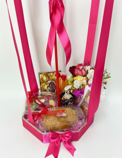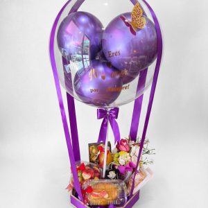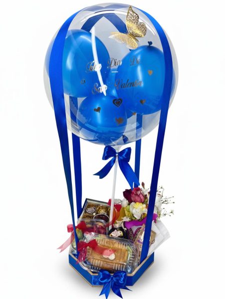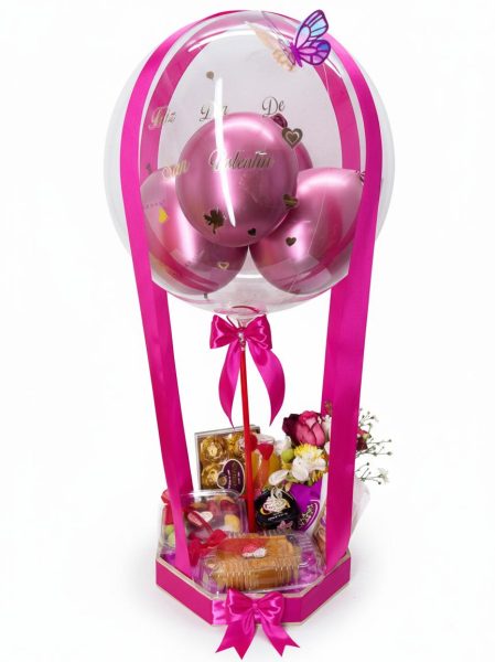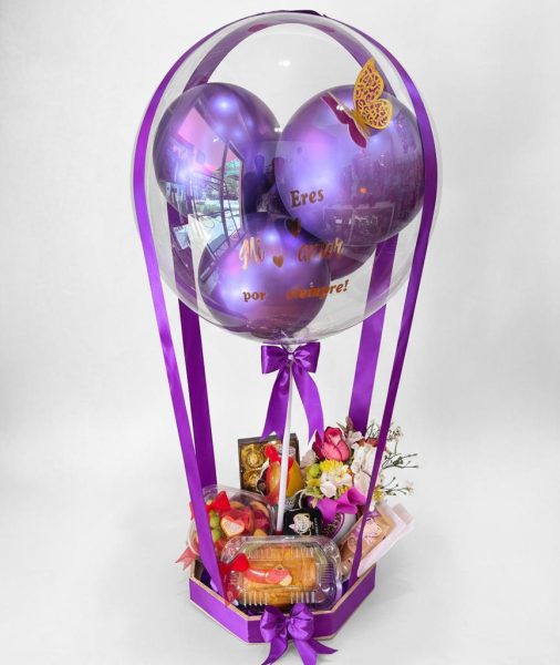 Nuestra bandeja de madera resistente viene decorada con cinta de colores de tu preferencia, y se acompaña de un hermoso globo Burbuja con varios globos dentro de él, dándole forma de globo Aeroestático de San Valentín, decorado con cintas y papelillo. Incluye también un bouquet de flores de temporada, con oasis para mayor durabilidad, colocado